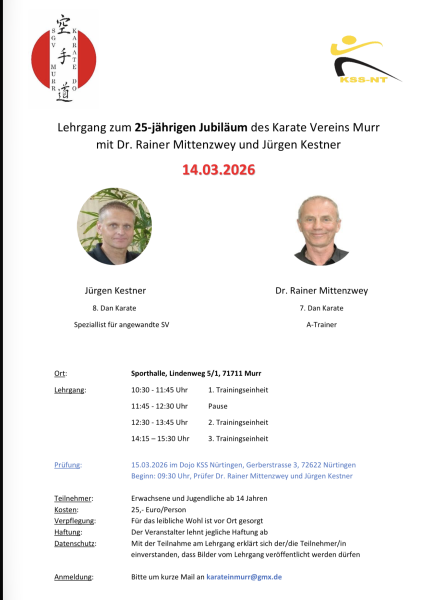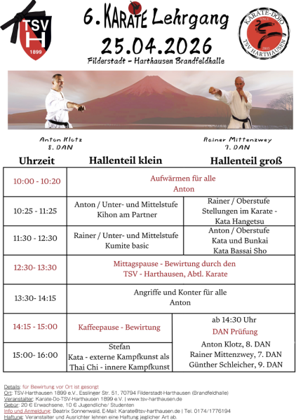 Oder - Wann ist eine Veranstaltung ein Klassiker? - wenn trotz aller rückläufigen Entwicklungen im Vereinssport viele Interessierte kommen - wenn sich fast alle Teilnehmenden begeistert über das bewährte Angebot äußern - wenn sich wieder Trainer aus der näheren Umgebung einfinden und bereit sind, ihr Karatewissen und -können zu teilen Insgesamt 12 Trainingsangebote in 3 verschiedenen Hallenteilen ermöglichen: zusammen kommen, miteinander trainieren, voneinander lernen. Das ist nicht nur ein Slogan ist, sondern genau das wird gelebt. Ganz bewusst werden Angebote, die mit Kampfkunst und verschiedenen Aspekten der Selbstverteidigung, der Körper- und Wahrnehmungsschulung zu tun haben, gemacht.Erfolgreicher Jahresauftakt 2025 der Masters aus der Dojogemeinschaft